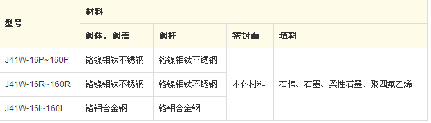 【產(chǎn)品說(shuō)明】J41W型PN16~PN160不銹鋼截止閥:手動(dòng)、法蘭連接、直通式、閥座密封面材料為 0Cr18Ni9 系不銹鋼(J41W-16P~160P)、0Cr17Ni12Mo2 系不銹鋼(J41W-16R~160