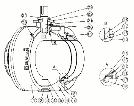 圖中數(shù)字解析:1表示閥體,2表示下閥桿座,3、6、12、18表示O型圈,4表示下軸襯,5表示平面軸襯,7表示閥蓋,8表示球體,9表示壓板圈,10表示彈簧,11表示防火墊,13表示閥座,14密封圈,15表示上軸襯,16表示平面軸襯,17表示上閥桿座,19表示閥座注脂閥,20表示閥桿注脂閥,21表示閥桿,22表示填料,23表示壓蓋,24表示螺釘,25表示排泄閥。